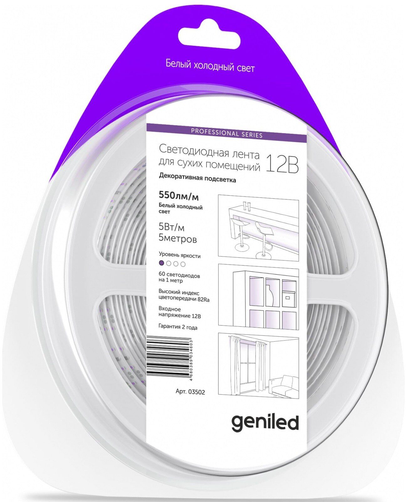 Лента светодиодная 2835 5 Вт/м 6000-6500 К IP33 12 В 5 м GENILED (03502) имеет мягкоее свечение. Приглушенный свет станет отличным сопровождением домашнего кинопросмотра, подойдет для зонирования пространства и создания нужной обстановки. Белый холодный свет обеспечит бодрое рабочее настроение. Лента проста в монтаже, возможно отрезать нужную длину. Самоклеящаяся поверхность позволяет надежно закрепить ленту на любой гладкой поверхности. Для управления яркостью используйте диммер (приобретается отдельно). Рабочая температура -40 до +60 С.