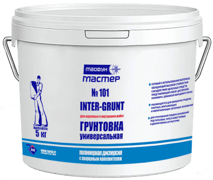 Грунтовка полимерная ТАЙФУН Мастер Inter-Grunt №101 с кварцевым песком 5 кг применяется для подготовки оснований перед нанесением гипсовых и цементных штукатурок, а также перед использованием гипсовых клеев и клеящих растворов. Это готовый к использованию материал, обладающий высокой стойкостью к воздействию щелочных сред, представляющий собой дисперсию полимера с добавлением кварцевого песка. Нанесение грунтовки с содержанием наполнителя позволяет получить шероховатую поверхность, что значительно увеличивает адгезию очередных слоев материала с основанием и позволяет получить высококачественное штукатурное покрытие внутри и снаружи помещений.