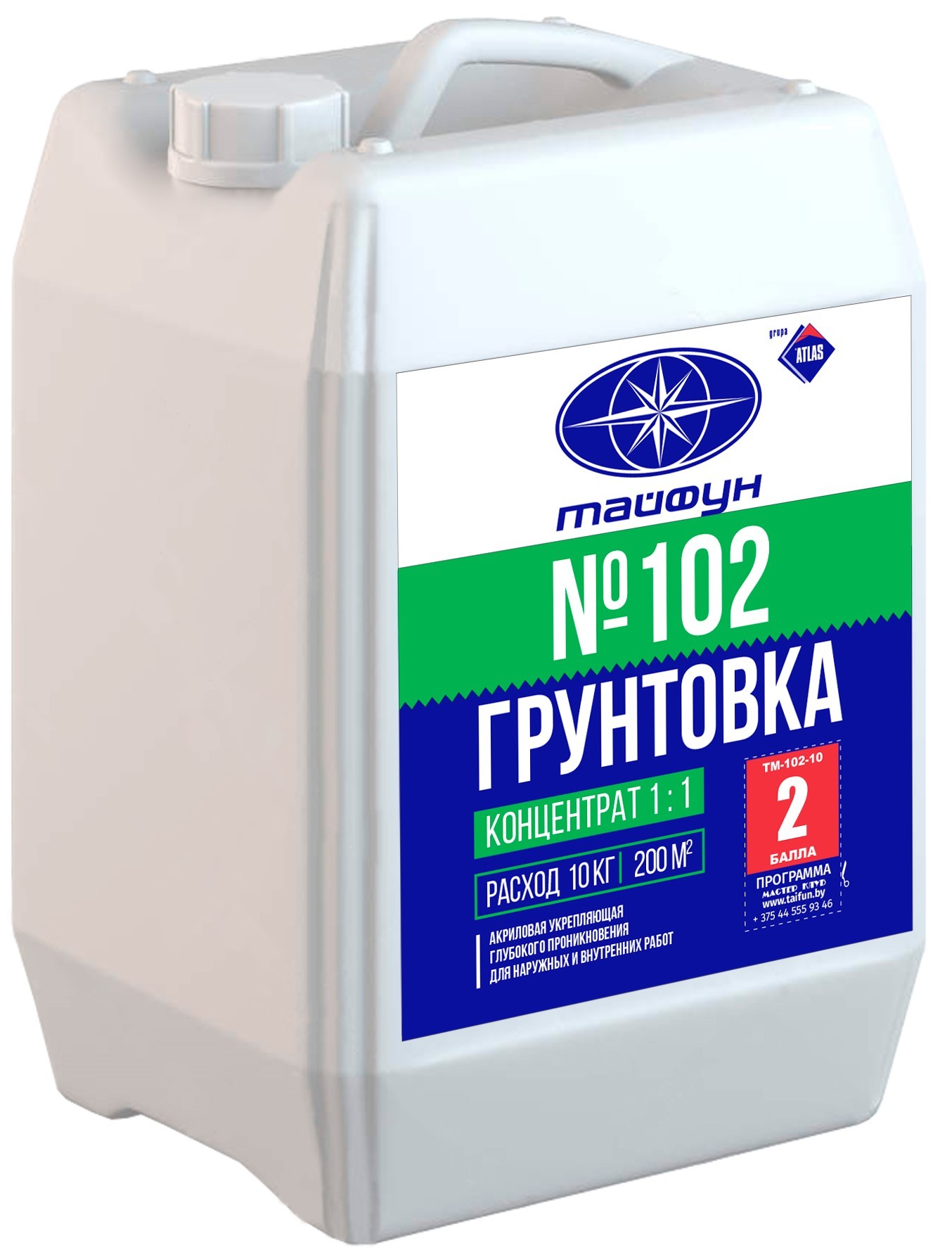 Грунтовка акриловая ТАЙФУН Мастер №102 концентрат 10 кг применяется для укрепления пористых и не прочных минеральных оснований. Улучшает адгезию последующего отделочного слоя. Предназначена для работ внутри и снаружи помещений. Разбавляется чистой водой в соотношении 1:1 (1 часть концентрата и 1 часть воды).