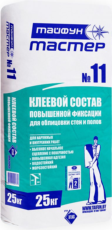 Клей для плитки ТАЙФУН Мастер №11 25 кг применяется для облицовки оснований плиткой различного размера, мозаикой, натуральным и искусственным камнем. Отлично ведет себя при эксплуатации в условиях повышенной влажности или при постоянном контакте с водой. Используется для наружных и внутренних работ.Виды основания: цементные, цементно-известковые, гипсовые штукатурки и стяжки, неоштукатуренные стены из кирпича, блоков из ячеистого бетона.Виды приклеиваемых плиток: ГРЕС и керамические плитки размером более 0,16 м² (40 х 40 см), мозаика, искусственный или натуральный камень размером более 0,16 м2 (40 х 40 см).