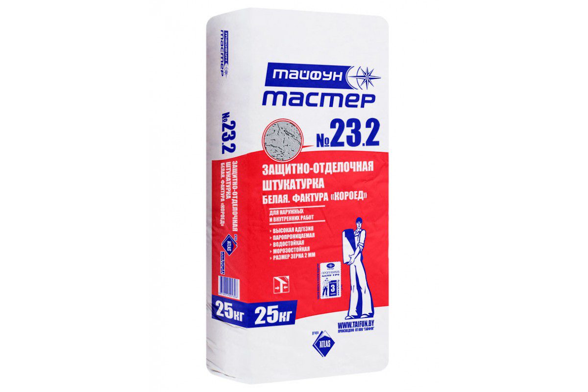 Тайфун Мастер №23.2 штукатурка белая цементная финишная с фактурой “Короед” 2,0мм (меш 25кг) является декоративной и защитной отделкой поверхности фасадов и внутренних стен. Штукатурка применяется для устройства защитно-отделочного слоя с фактурой «короед». Используется в легкой штукатурной системе утепления «Тайфун», а также для устройства отделочных покрытий по минеральным основаниям внутри и снаружи зданий.