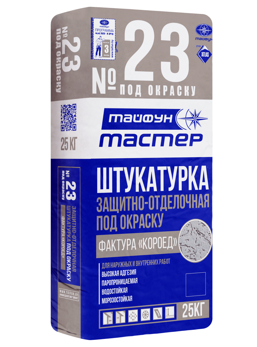ЗАЩИТНО-ОТДЕЛОЧНАЯ ШТУКАТУРКА «Тайфун Мастер» №23 применяется для устройства защитно-декоративного слоя с фактурой «короед» в системах теплоизоляции и отделки «Тайфун», а также для устройства отделочных покрытий по любым минеральным основаниям внутри и снаружи помещений.