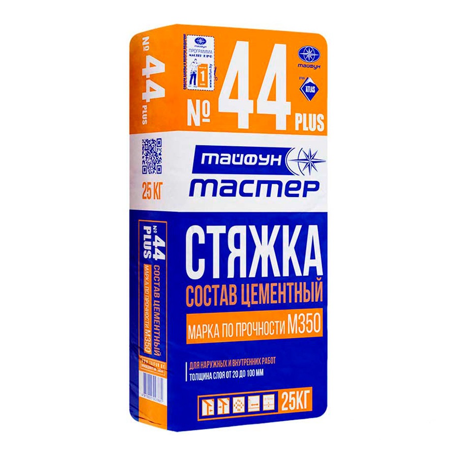 Стяжка цементная ТАЙФУН Мастер №44 Plus 25кг – производится в виде сухой смеси, состоящей из цементного вяжущего, заполнителя и специально подобранных модифицирующих добавок высокого качества. Возможно устройство стяжки на наклонных поверхностях и для выполнения разуклонки. Может использоваться для ремонта существующих цементных стяжек. Рекомендуется использовать в жилых помещениях, зданиях общественного и производственного назначения с последующей отделкой керамической плиткой, плиткой из натурального камня, паркетом и другими видами напольных покрытий, не может служить финишным покрытием пола. Может использоваться в системах отопления «теплый пол». Для наружных (отмостки, дорожки, рампы) и внутренних (жилые и складские помещения, офисы, подвалы, гаражи) работ.