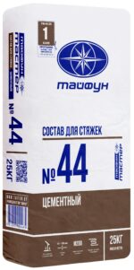 Стяжка цементная ТАЙФУН Мастер №44 25 кг предназначена для устройства цементной стяжки с целью выравнивания местных неровностей и придания необходимого уклона основанию. Рекомендуется использовать в жилых помещениях, зданиях общественного назначения с последующей отделкой керамической плиткой, плиткой из натурального камня, паркетом и др.Виды основания: цементная стяжка (возраст более 28 дней, влажность ≤ 6 %); бетон (возраст более 3 месяцев, влажность ≤ 6 %).