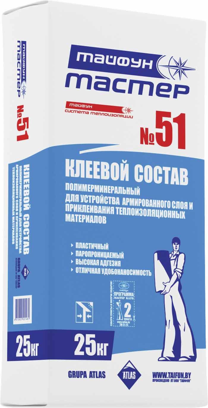 Клей для теплоизоляции ТАЙФУН Мастер №51 25 кг предназначен для устройства армированного слоя по пенополистирольным и минераловатным плитам в легкой штукатурной системе утепления зданий и сооружений методом «Тайфун». Также может быть использован для приклеивания теплоизоляционных материалов к утепляемой поверхности.Виды основания: бетон, газобетон, штукатурки цементные и цементно-известковые, а также неоштукатуренные стены из кирпича, блоков и других поверхностей новых или находящихся в эксплуатации зданий.