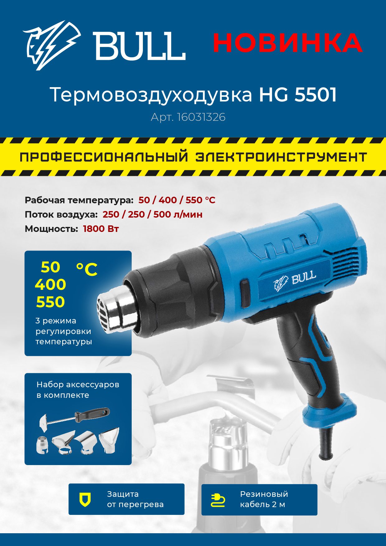 Фен строительный (термовоздуходувка) BULL HG 5501 (16031326) имеет широкий диапазон допустимых температур: 50/400/550 °С, что делает фен пригодным для различных видов работ. Нагреватель имеет керамические элементы. Прочный кейс упрощает хранение инструмента. Набор акссессуаров в комплекте. Имеет защиту от перегрева. Возможно стационарное использование.