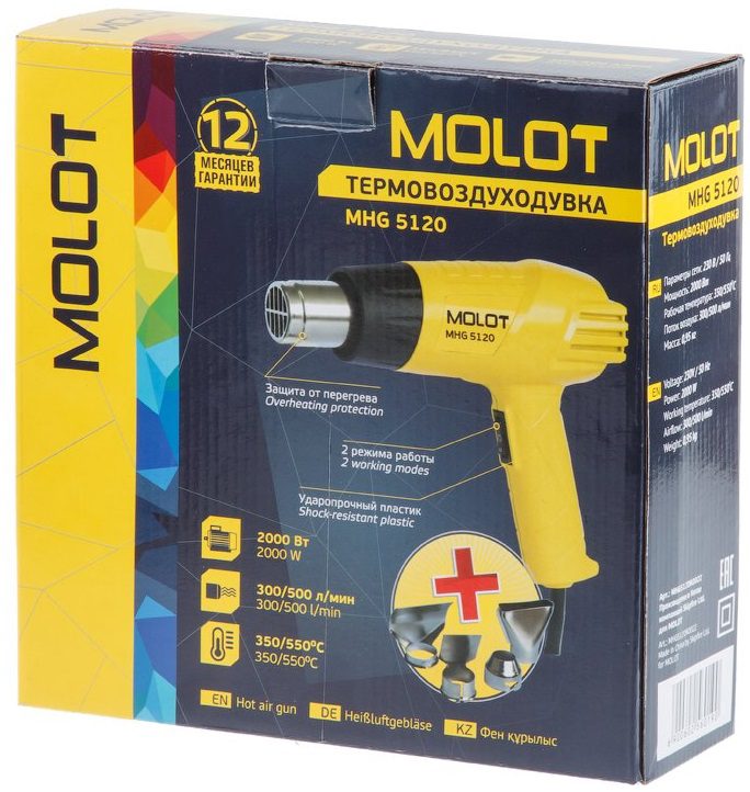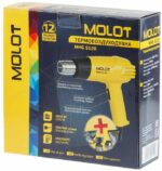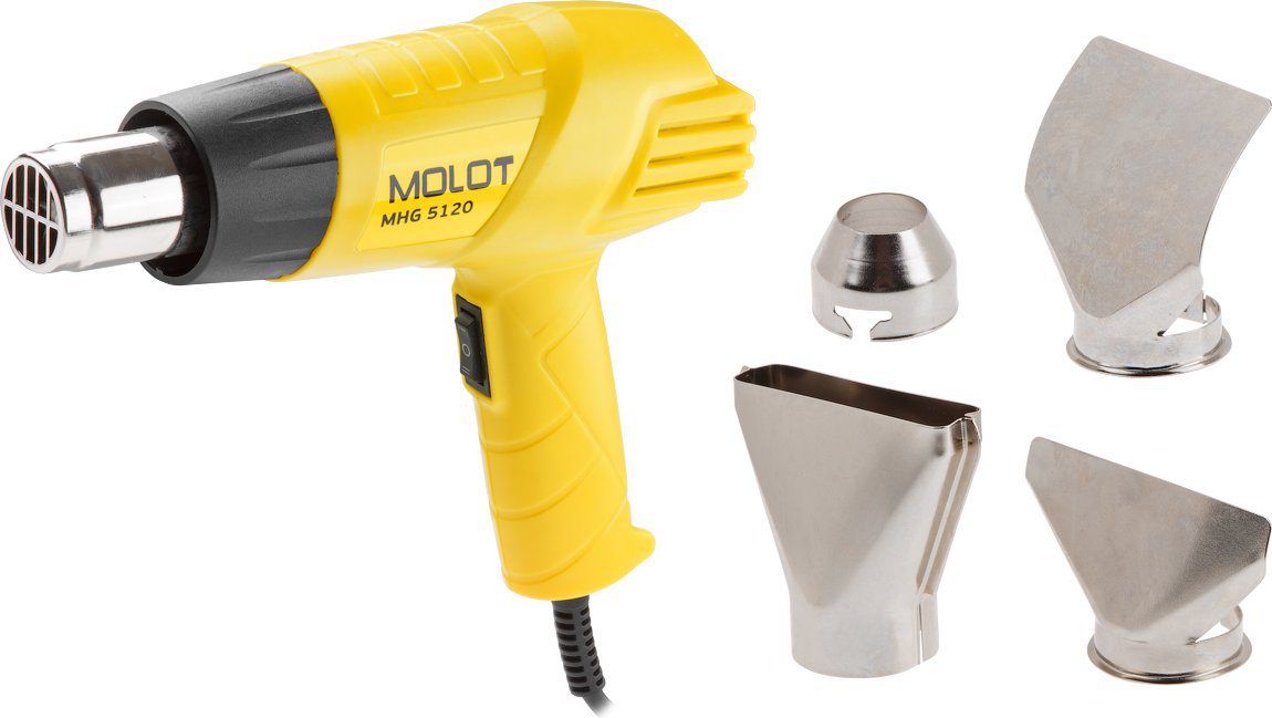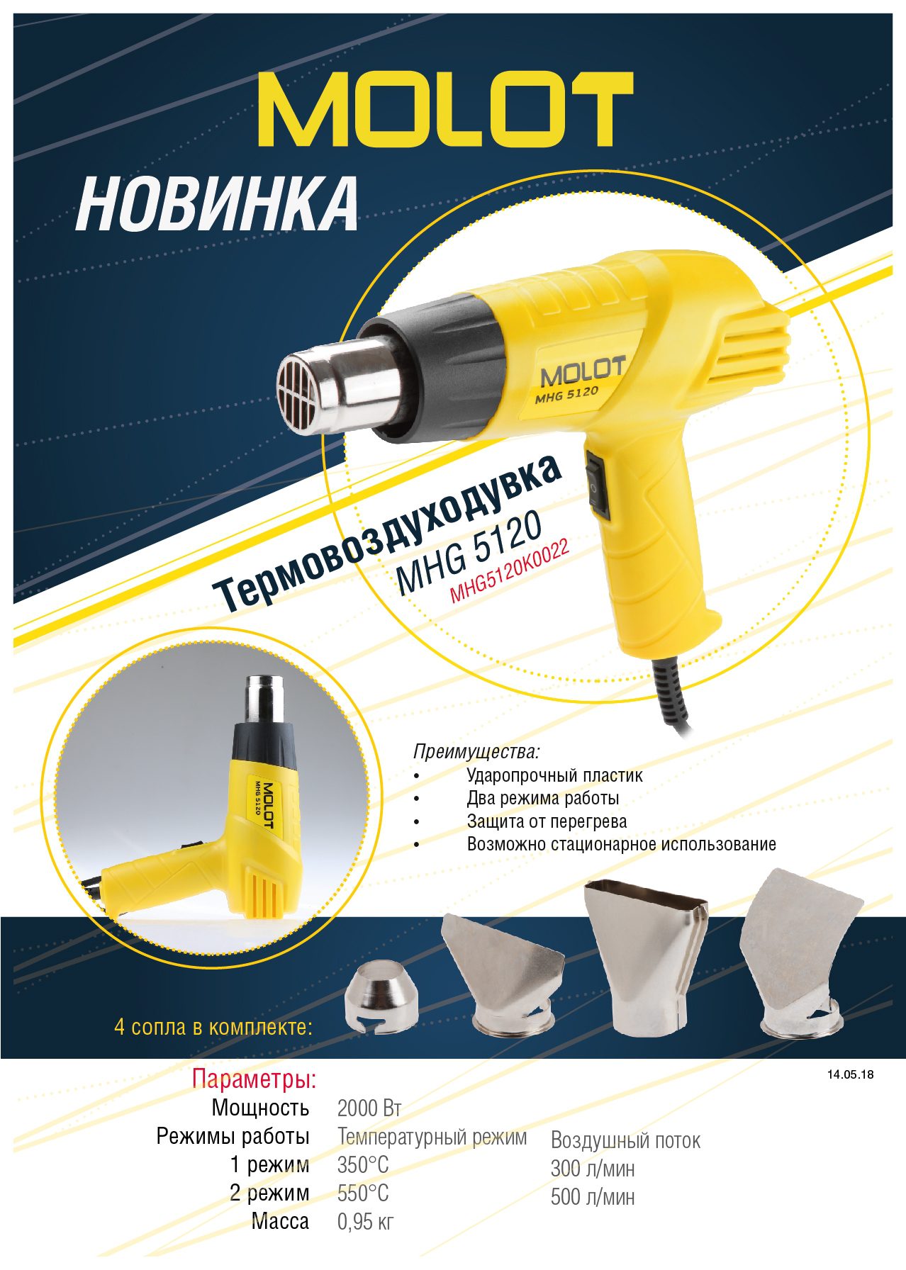 Фен строительный (термовоздуходувка) MOLOT MHG 5120 (MHG5120K0022) выполнен из ударопрочного пластика, имеет два режима работы и оснащена защитой от перегрева. Возможно стационарное использование.