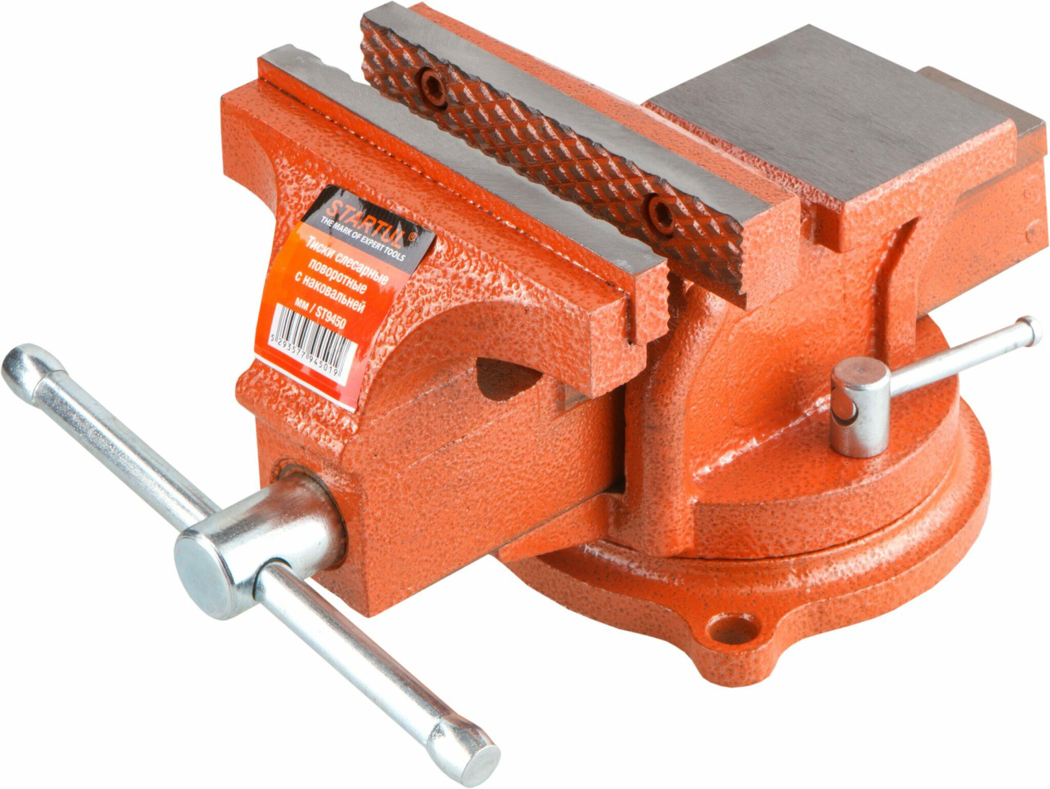 Тиски слесарные 100 мм поворотные STARTUL Master (ST9450-100) предназначены для фиксации обрабатываемой заготовки. Изготавливаются литьем из чугуна. Оснащены поворотным механизмом и полированной наковальней. Закаленные губки с насечками гарантируют надежность захвата. Для придания повышенной коррозионной стойкости неподвижные детали инструмента покрыты защитно-декоративным покрытием.