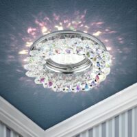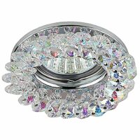 Светильник точечный под лампу GU5.3 ЭРА DK16 CH/PR хром/перламутровый (Б0005210) круглый с мелкими хрусталиками станет эффектным решением для любого помещения: его можно разместить в спальне, в детской или на кухне. Светильник можно использовать как в качестве базового освещения, так и для создания акцентов в определенных зонах комнаты. Благодаря скрытой части корпуса светильники можно встраивать в потолок или стены, создавая разный дизайн помещений. Встраиваемый светильник ЭРА с приятным дизайном подойдет для помещений с разным интерьером: от минимализма до хай-тека, прованса или скандинавского стиля. При помощи точечных светильников можно освещать только те участки помещения, которыми вы пользуетесь в данный момент, не затрачивая лишнюю элеткроэнергию. Максимальная мощность лампы – 50 Вт. Корпус встраиваемого светильника изготовлен из нержавеющей стали. Диаметр отверстия, требуемого для установки светильника составляет 65 мм, а диаметр самого светильника – 90 мм.