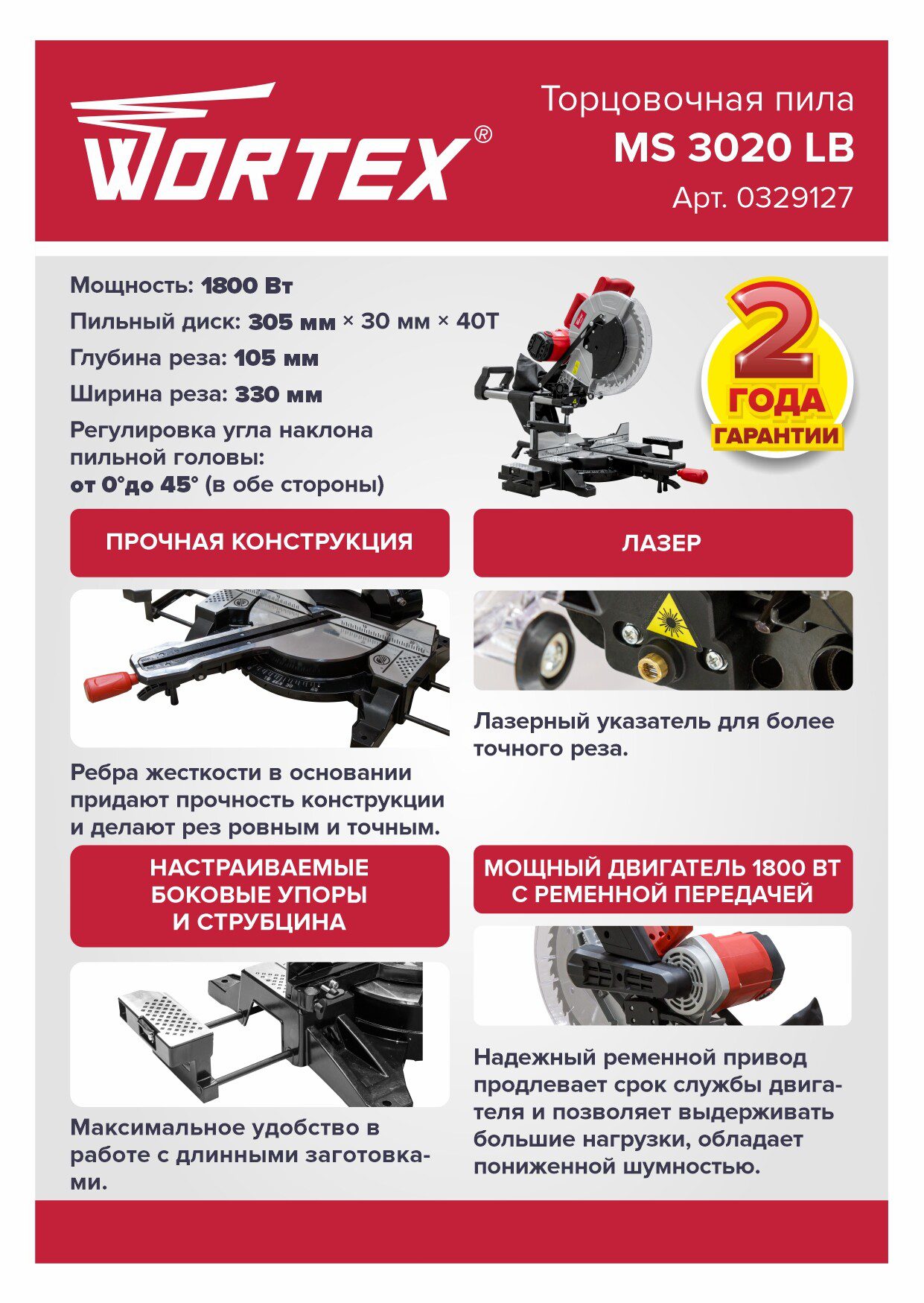 Пила торцовочная WORTEX MS 3020 LB (0329127) обладает мощным двигателем с ременной передачей, что в свою очередь делает его более надежным и менее шумным, имеется система пылеудаления, лазерный указатель для более точного реза, металлические скользящие полозья, плавный ход реза, система быстрого зажима заготовки, точный рез. Быстрая регулировка глубины и ширины реза. Правый/левый наклон пильной головы. А так же наличие ребер жесткости в основании придает дополнительную мощность конструкции, что очень важно для торцовочной пилы.