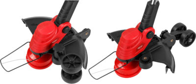 Также, модель оснащена двумя кожухами, один из которых с колёсами, что позволяет легко маневрировать вокруг деревьев, кустов и других препятствий, а, также, упрощает рабочий процесс и позволяет добиться ровного среза.