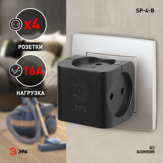 Разветвитель для розеток четверной ЭРА SP-4-B черный (SP-4-B) имеет четыре стандартных евровхода. Максимальна мощность – 16А/3500 Вт, материал корпуса – поликарбонат (пластик премиум сегмента). Эксклюзивный продакт-дизайн.