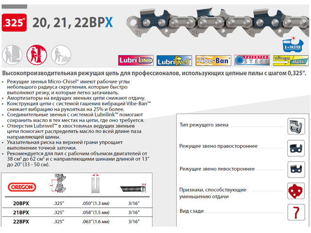Цепь 21BPX OREGON предназначена для профессионального использования на пилах с шагом 0,325″. Оптимально подойдет для бензопил с объемом двигателя 38 – 62 см3. Высокая эффективность и простота заточки благодаря режущей кромке с небольшим радиусом скругления, и метке горизонтальной грани резца. Ведущие звенья с амортизатором снижают вибрацию инструмента, увеличивая производительность и безопасность пользователя. Эффективная смазка подвижных частей, в том числе в зонах повышенного трения благодаря специальным отверстиям в соединительных и хвостовиках ведущих звеньев. Простота заточки благодаря метке горизонтальной грани резца.