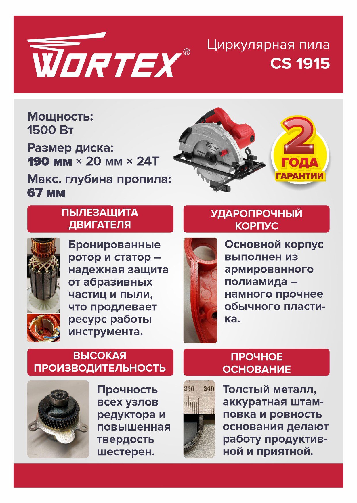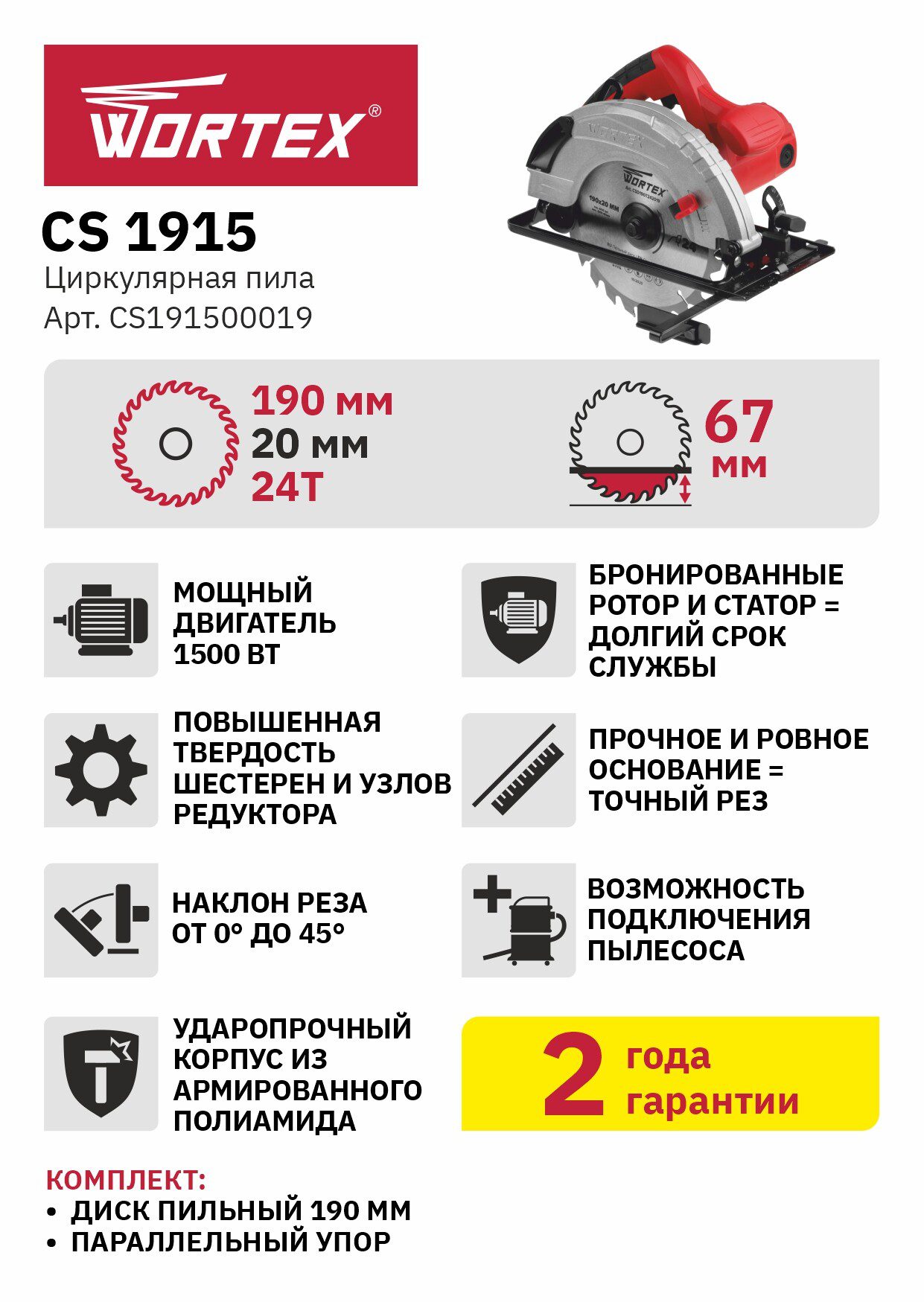 Пила циркулярная WORTEX CS 1915 (CS191500019) – мощная, но при этом легкая и компактная пила. Подойдет для продольных и косых пропилов при максимальном уровне комфорта. Можно регулировать глубину и угол наклона пропила. Широкая алюминиевая платформа. Прорезиненная рукоятка.