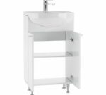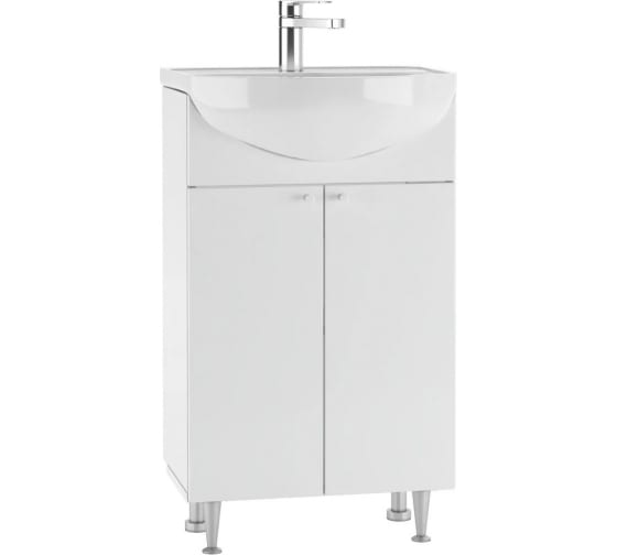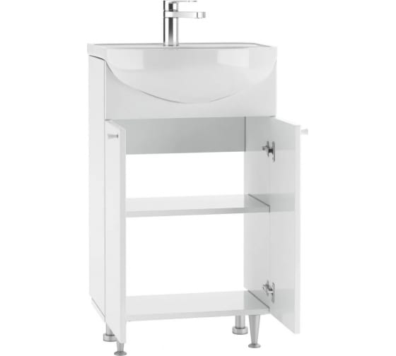 Тумба под умывальник Домино Айсберг Промо 50 напольная — современная практичная тумба, произведенная из влагостойких материалов: корпус — ЛДСП, фасад — МДФ с пленочным покрытием. Внутреннее пространство разделено полкой для удобного хранения принадлежностей.