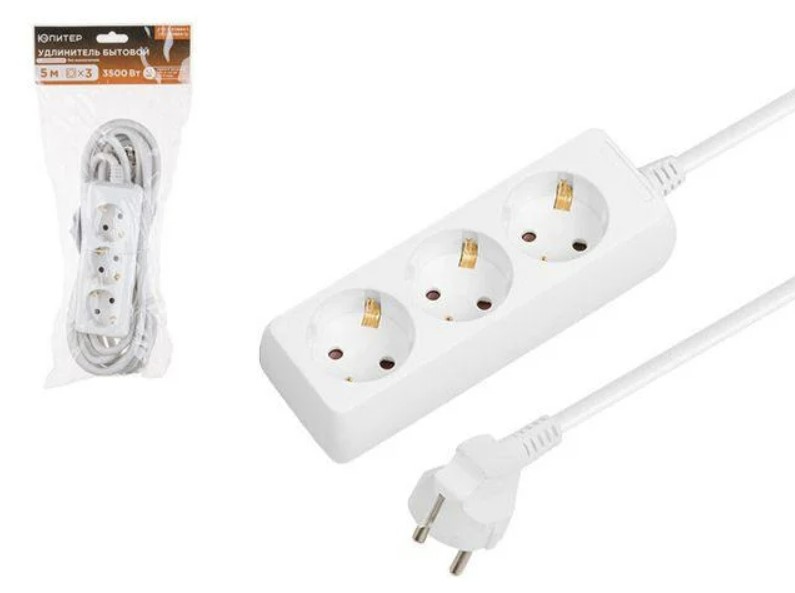 Удлинитель 5 м 3 розетки 3,5 кВт с заземлением ЮПИТЕР белый (JP8105-23) предназначен для присоединения электро- и радиоустройств к электрической сети переменного тока напряжением 220В. Используется в быту, офисе или частном доме.