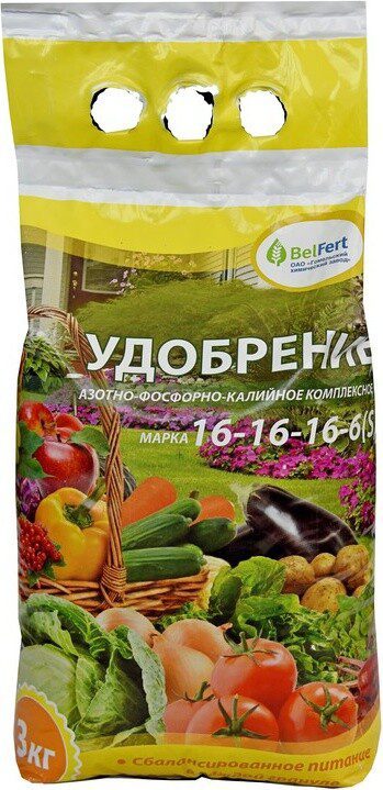 Удобрение минеральное ГОМЕЛЬСКИЙ ХИМИЧЕСКИЙ ЗАВОД Марка 16-16-16-6 3 кг – концентрированное комплексное удобрение. Рекомендуется для основного внесения (весной под перепашку, культивацию или перекопку участка) под все сельскохозяйственные культуры для закрытого и открытого грунтов. Можно вносить в лунки при посадке картофеля или рассады овощных культур (капуста, томаты).