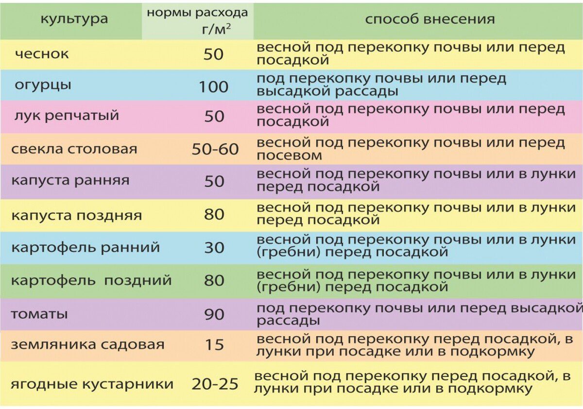 Оптимальные дозы для внесения в почву: – картофель – 30 г/м2; – капуста ранняя, редис, лук, чеснок – 50 г/м2; – капуста поздняя – 8 г/м2; – морковь – 50 г/м2; – фасоль, морковь – 70 г/м2; – свекла столовая – 50-60 г/м2; – огурцы – 75 г/м2; – томаты – 90 г/м2; – земляника – 15 г/м2. Для подкормки под плодовые деревья весной вносят 20-25 г на 1 м2 приствольного круга, под ягодные кустарники – 20-25 г.