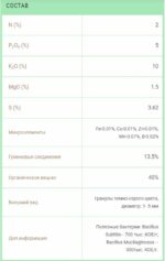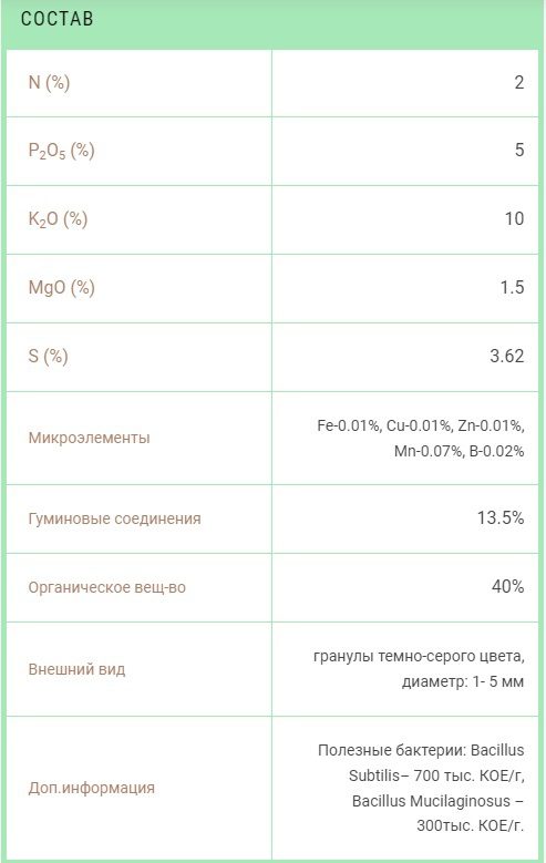 Содержание питательных веществ: азот (2%), фосфор (5%), калий (10%), магний (1,5%) + гуминовые соединения + микроэлементы.