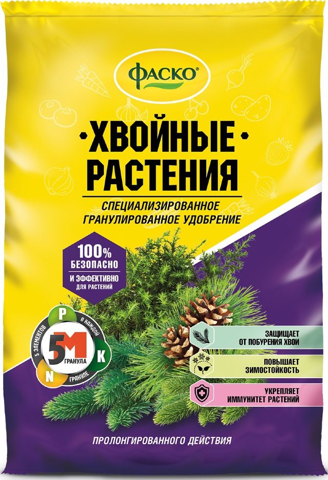 Удобрение минеральное ФАСКО 5М Для хвойных растений 1 кг произведено по уникальной технологии на российском рынке, обеспечивающей дополнительные преимущества продукции перед традиционными аналогамиМинеральное удобрение “5М-гранула”: каждая гранула содержит 5 питательных макро и микроэлементов. Обеспечивает равномерное и полноценное питание растений. Гарантирует эффективность применения выше, чем дают обычные тукосмеси (подтверждено вегетативными опытами). Обладает пролонгированным действием. Применяется для ухода за многолетними хвойными культурами: елями, соснами, пихтами, можжевельниками, туями и многими другими. Оптимальные пропорции питательных элементов способствуют укреплению иммунитета и повышению зимостойкости растений. Наличие в составе магния и кальция обеспечивает сохранность зеленого окраса хвои круглый годПреимущества: Одинаковый состав питательных элементов в каждой грануле. Пролонгированное действие. Защита от побурения хвои. Рекомендации по применению: При посадке саженцев удобрение перемешивают с почвой, вынутой из посадочной ямы. При основном внесении удобрение равномерно рассыпать по поверхности почвы и провести вспашку, перекопку или рыхление. При внесении удобрения в подкормку равномерно распределите его по всей площади приствольного круга с последующей заделкой, рыхлением или перекопкой, при необходимости произвести полив. Нормы внесения: на окультуренных почвах – 50-100г/м2, на неокультуренных – 70-120 г/м2.