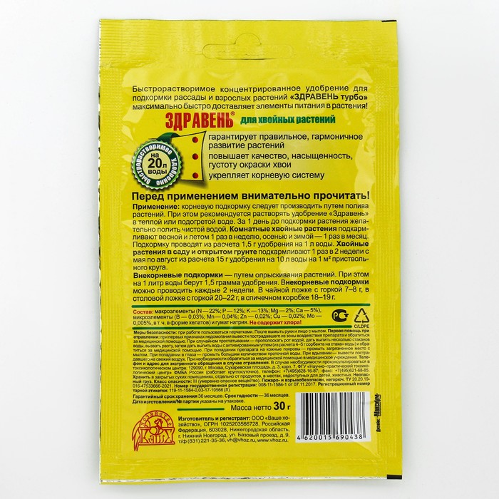 Удобрение минеральное ВАШЕ ХОЗЯЙСТВО Здравень турбо для Хвойных 30 гр обеспечивает правильное, гармоничное развитие растения. Повышает качество, густоту и насыщенность окраски хвои. Укрепляет корневую систему.