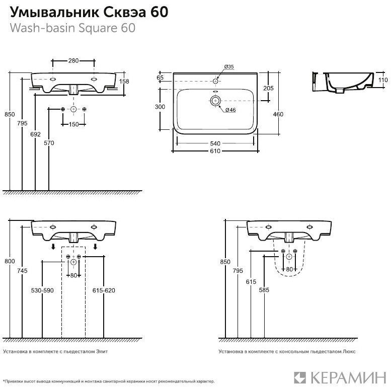 Умывальник КЕРАМИН Сквэа 60 – современный подвесной умывальник, который станет стильным дополнением лаконичного интерьера ванной комнаты. Прямые линии и минималистичный дизайн отражают стремление жить в ногу со временем и быть в курсе последних тенденций керамической моды. Умывальники Керамин изготовлены из 100%-ного фарфора. Обладают абсолютной белизной, безупречным качеством глазури и точной геометрией. Умывальник так же можно установить на пьедестал “Элит”.