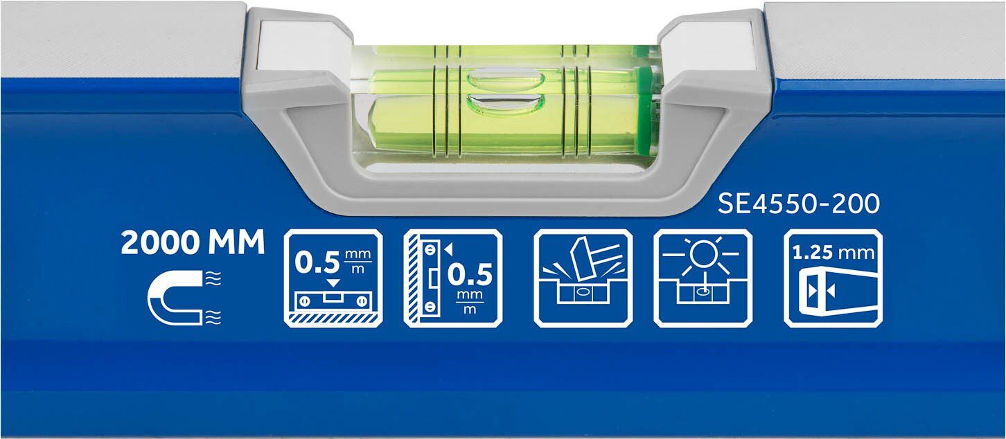 Уровень магнитный STARTUL EXPERT 2000 мм (SE4550-200) – надежный и прочный инструмент в помощь, как профессиональному строителю, так и домашнему мастеру. Уровень выполнен из алюминия. На корпусе установлены 3 ампулы в удоропрочных блоках (1 ампула – измерение горизонтали, 1 ампула – измерение вертикали, 1 ампула – угол 45°). Для вертикальной ампулы предусмотрен зеркальный глазок. Фрезерованная рабочая поверхность. Толщина профиля 1,25 мм.