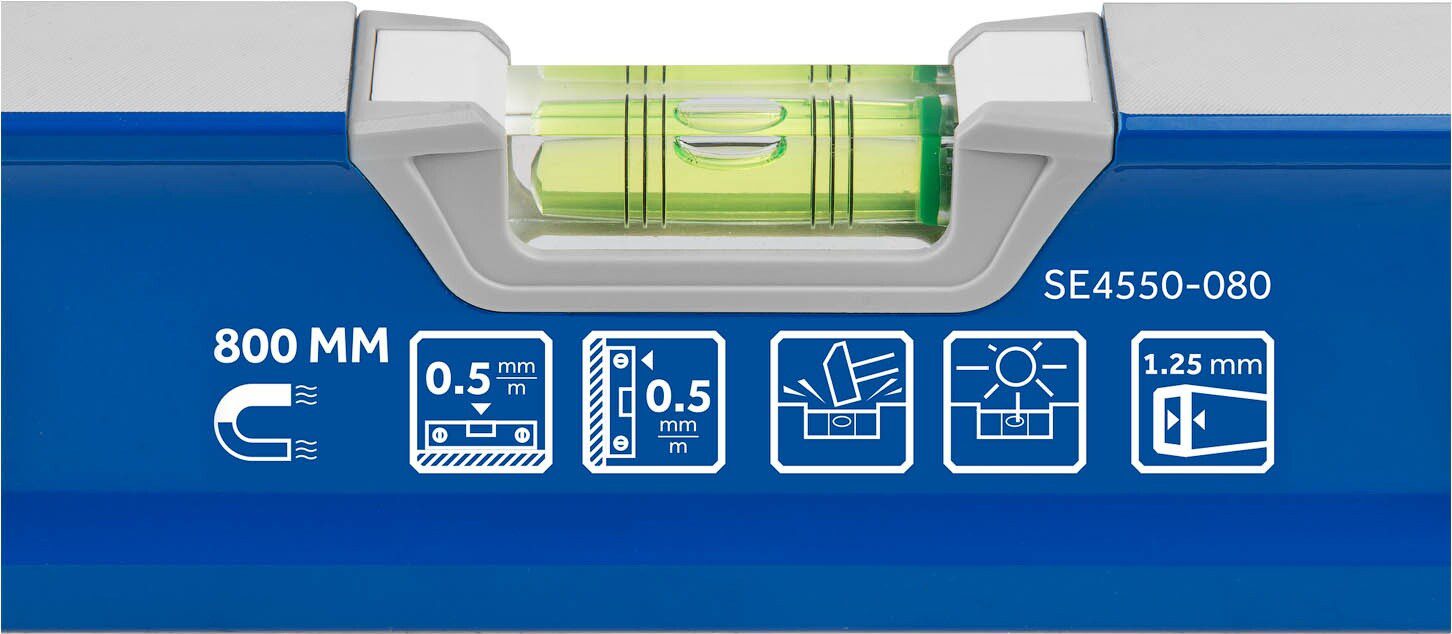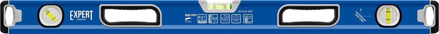 Уровень магнитный STARTUL EXPERT 800 мм (SE4550-080) – надежный и прочный инструмент в помощь, как профессиональному строителю, так и домашнему мастеру. Уровень выполнен из алюминия. На корпусе установлены 3 ампулы в удоропрочных блоках (1 ампула – измерение горизонтали, 1 ампула – измерение вертикали, 1 ампула – угол 45°). Для вертикальной ампулы предусмотрен зеркальный глазок. Фрезерованная рабочая поверхность. Толщина профиля 1,25 мм.