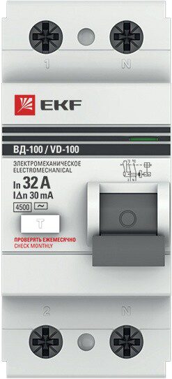 УЗО EKF PROxima ВД-100 2P 32А тип AC 30мА (elcb-2-32-30-em-pro) предназначено для защиты человека от поражения электрическим током при прикосновении к открытой проводке или к электрооборудованию, оказавшемуся под напряжением и для предотвращения возгорания, возникающего вследствие длительного протекания токов утечки и развивающихся из них токов короткого замыкания. Для защиты потребителей от токов перегрузки и короткого замыкания необходимо использовать УЗО совместно с автоматическими выключателями. Возможность работы при – 25 °С. Тип устройства – электромеханическое.