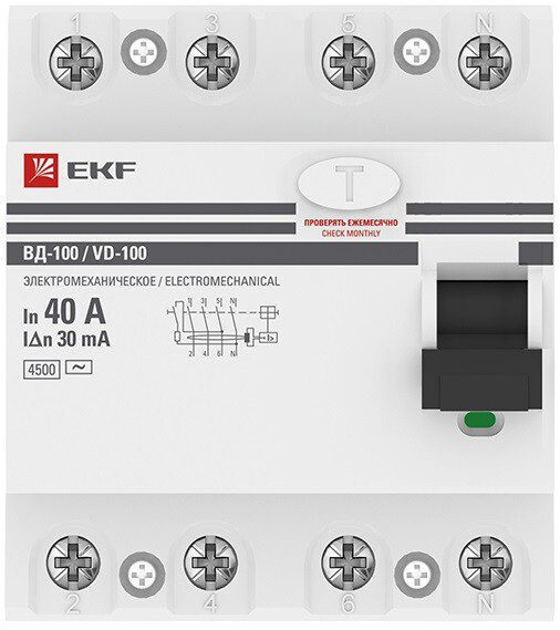 УЗО EKF PROxima ВД-100 4P 40А тип AC 30мА (elcb-4-40-30-em-pro) предназначено для защиты человека от поражения электрическим током при прикосновении к открытой проводке или к электрооборудованию, оказавшемуся под напряжением и для предотвращения возгорания, возникающего вследствие длительного протекания токов утечки и развивающихся из них токов короткого замыкания. Для защиты потребителей от токов перегрузки и короткого замыкания необходимо использовать УЗО совместно с автоматическими выключателями. Возможность работы при – 25 °С. Тип устройства – электромеханическое.