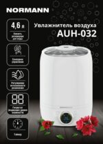 Увлажнитель воздуха NORMANN AUH-032 необходим для создания оптимальной влажности в помещении. Ультразвуковая технология работает бесшумно. Большой объем резервуара для воды (4,6 литра). Прибор имеет регулировку интенсивности увлажнения и регулировку направления потока струи. Если вода в увлажнителе закончилась, то прибор сообщит об этом звуковым сигналом. Сенсорное управление на корпусе. Встроенный гигростат (индикация уровня влажности) и термометр (индикация температуры воздуха). Увлажнитель способен поддерживать заданный уровень влажности. Прибор имеет LCD-дисплей с индикацией всех режимов и функций. В ночном режиме индикация отключается. Уровень шума не более 35 дБ. Электропитание: 220-240 В ~ 50 Гц. Максимальная производительность: 350 мл/ч. Класс защиты: II. Рабочая температура: +5°С – +40°С.