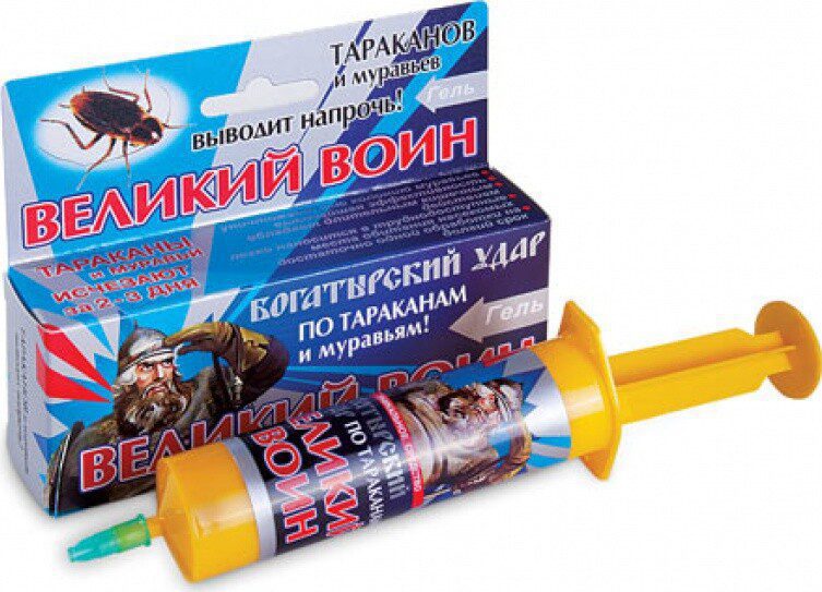 Гель для уничтожения тараканов и муравьев ВЕЛИКИЙ ВОИН 45 г против тараканов и домашних муравьев. Действует длительное время, рекомендуется профессионалами, обладает длительным кишечным действием, легко наносится в труднодоступные места обитания насекомых, высокая избирательная активность по отношению к тараканам и муравьям.Отличительное свойство этого геля в том, что он содержит в своем составе сразу два действующих вещества (хлорпирифос и диазинон). Они усиливают действие друг друга и уничтожают даже самых устойчивых тараканов. Препарат этот настолько действенен, что уже через 2–3 дня полностью уничтожает всю тараканью колонию. Гель обладает «каскадным» эффектом: даже один съевший его таракан передает смертельную дозу яда своим сородичам. Очень привлекателен для тараканов своим запахом и вкусом.Гель «Великий Воин» не портится, не высыхает и не теряет своей эффективности в течение нескольких месяцев после применения. Это гарантирует надежную защиту Вашего жилища от тараканов на полгода и дольше. Гель удобен в применении, легко наносится даже в труднодоступные места. Не имеет неприятного запаха, не выделяет в воздух вредных веществ и может применятся людьми, страдающими аллергией или астмой.Один шприц-дозатор рассчитан на обработку помещений площадью 40-60 м². Кроме того, гель «Великий Воин» с успехом справляется с домовыми муравьями.Состав: диазинон — 0,2%, хлорпирифос — 0,3%, стабилизатор, консервант, гелеобразователь, битрекс и пищевые наполнители — до 100%.Способ применения: нанести средство пунктиром вдоль плинтусов, в щели и другие отверстия в которых могут укрываться тараканы. При высокой численности насекомых препарат наносят по периметру помещения пунктирной линией: 2 см геля — 6 см необработанной поверхности. При малой и средней численности тараканов интервал между полосками геля можно увеличить до 6–8 см. Гель можно наносить на подложку (30–50 мг) и расставлять в местах обитания, скопления или передвижения тараканов.Для уничтожения рыжих домовых муравьев гель наносят пунктиром в местах их обнаружения или на путях передвижения («дорожки») с интервалом от 2 до 6 см между полосками геля. Для уничтожения садовых и других видов муравьев, которые как правило, заползают на нижние этажи домов, коттеджей, веранд открытых террас, гель размещают на подложки или наносят не только по периметру помещений, но и снаружи их. Норма расхода: 30 мг/кв. м. Повторяют обработки при появлении муравьев. Гибель муравьев наступает через 1 сутки, а тараканов на 2 сутки.Повторное применение рекомендуется при появлении насекомых, но не ранее чем через 3 недели, т. к. состав, обладая кишечно-контактным действием, сохраняет свое действие 1,5–2 месяца.Меры предосторожности: Избегать контакта состава приманки с кожей; при случайном попадании обильно смыть водой. После работы со средством вымыть руки водой с мылом. Использовать только по назначению. Сразу же после использования контейнеры выбрасывают в мусоропровод. Хранить в сухом, прохладном, затемненном помещении, отдельно от пищевых продуктов, в местах, не доступных для детей и домашних животных.Срок годности: 2 года.