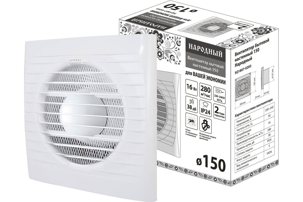 Вентилятор имеет надежный двигатель с низким энергопотреблением, встроенную защиту двигателя от перегрева. Предназначен для непрерывной работы и не требуют обслуживания. Защитная сетка от насекомых в комплекте. Также есть индикатор сети на передней панели вентилятора.