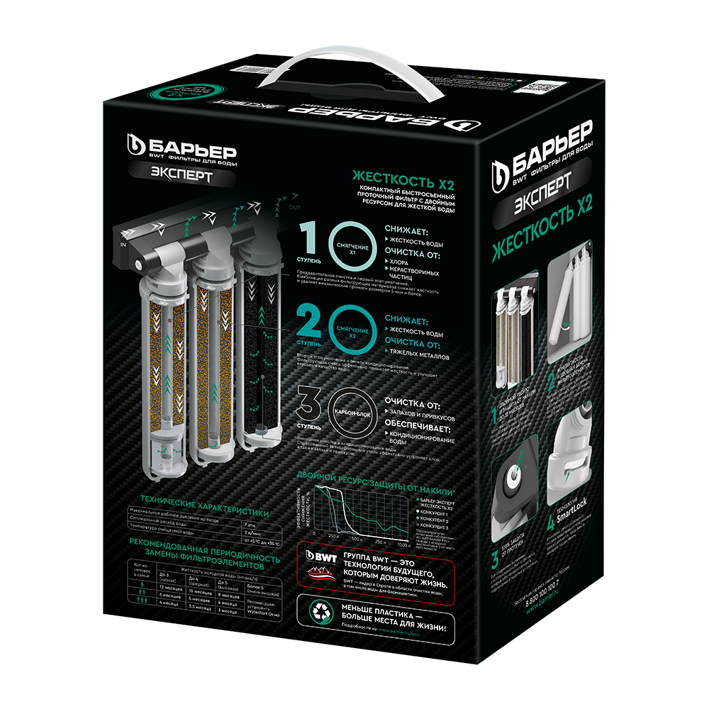 Фильтр-кувшин БАРЬЕР Эксперт Жесткость х2. Новый фильтр серии Expert для жесткой воды с удвоенным ресурсом до 12 месяцев. Уникальная разработка: композитный картридж первой ступени. Теперь в первой ступени к очистке от механических частиц добавляется очистка от солей жесткости, тяжелых металлов, хлора и хлорорганических соединений.