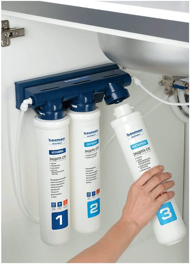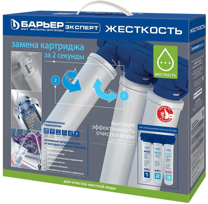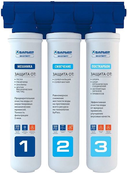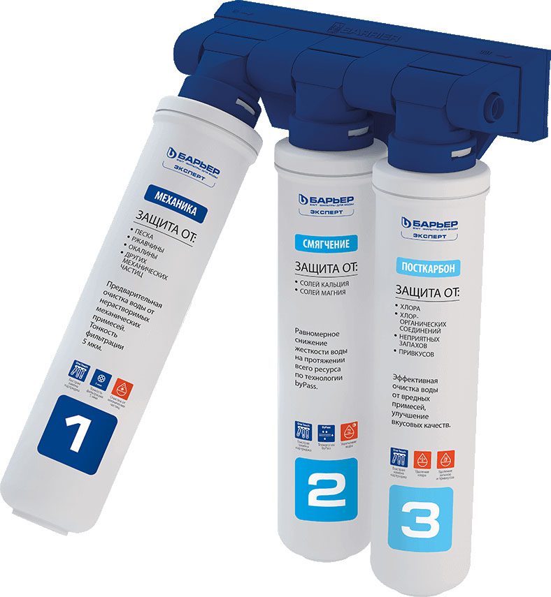 Фильтр проточный многоступенчатый БАРЬЕР Эксперт для жесткой воды. Обеспечивает эффективную очистку и снижение жесткости воды. Применение технологии «byPass» позволяет увеличить ресурс и избежать побочного эффекта гиперумягчения питьевой воды в начале ресурса. После фильтрации жесткость воды имеет оптимальный уровень для здоровья, отсутствует образование накипи.