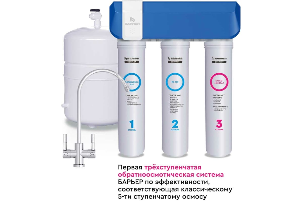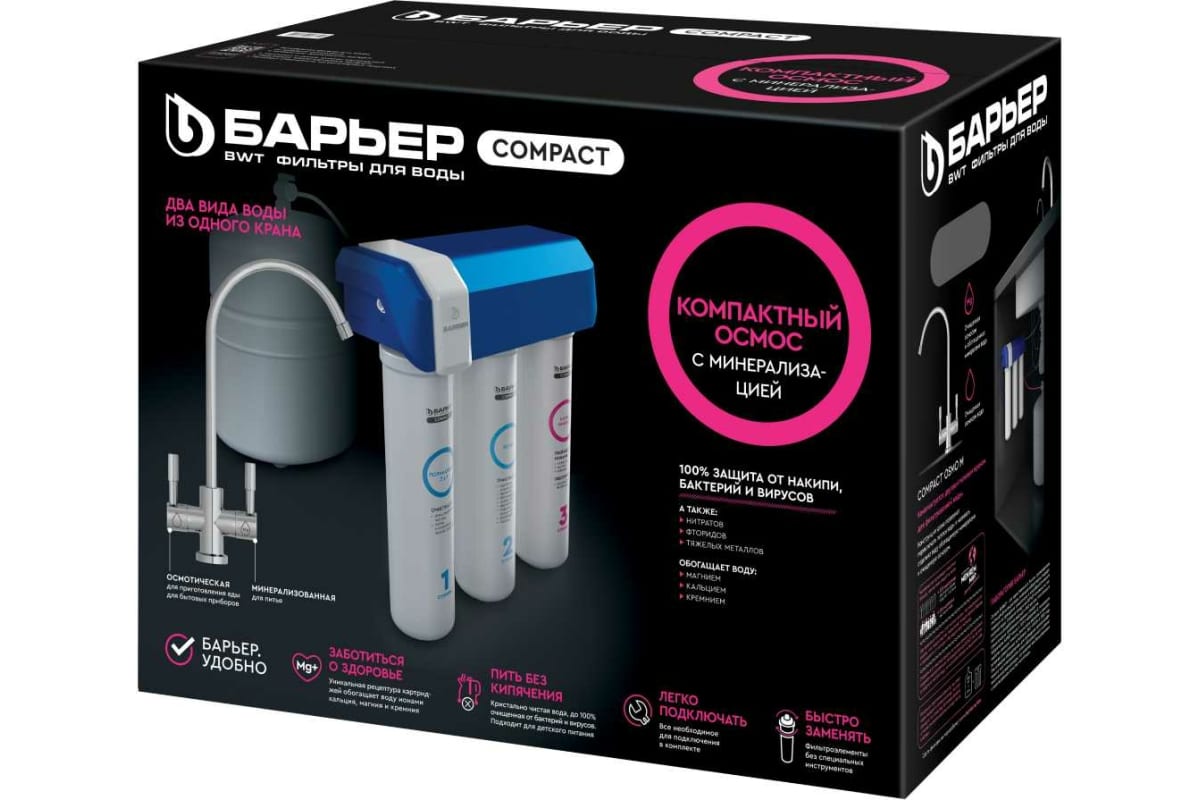 Фильтр обратного осмоса Барьер «COMPACT OSMO 100М» быстросъемный Н262Р02 – компактное стильное решение для кухни, трехступенчатая обратноосмотическая система с минерализатором БАРЬЕР по эффективности, соответствует классическому 5-ти ступенчатому осмосу.