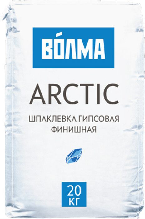 Шпатлевка гипсовая финишная ВОЛМА Arctic белая 20 кг — сухая шпатлевочная смесь на основе натурального гипса с размером частиц менее 0,2 мм, минеральных наполнителей и модифицирующих добавок, обеспечивающих трещиностойкость и повышенную адгезию. Применяется для финишной отделки стен и потолков внутри помещений с нормальной относительной влажностью под покраску, оклейку обоями и другие виды декоративной отделки. Для ручного применения.Вид оснований: поверхности с перепадами не более 3 мм (бетонные, гипсовые оштукатуренные поверхности, поверхности гипсокартонных и гипсоволокнистых листов, поверхности пазогребневых гипсовых плит).