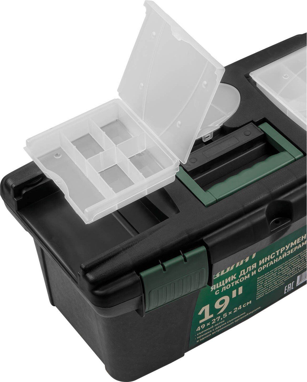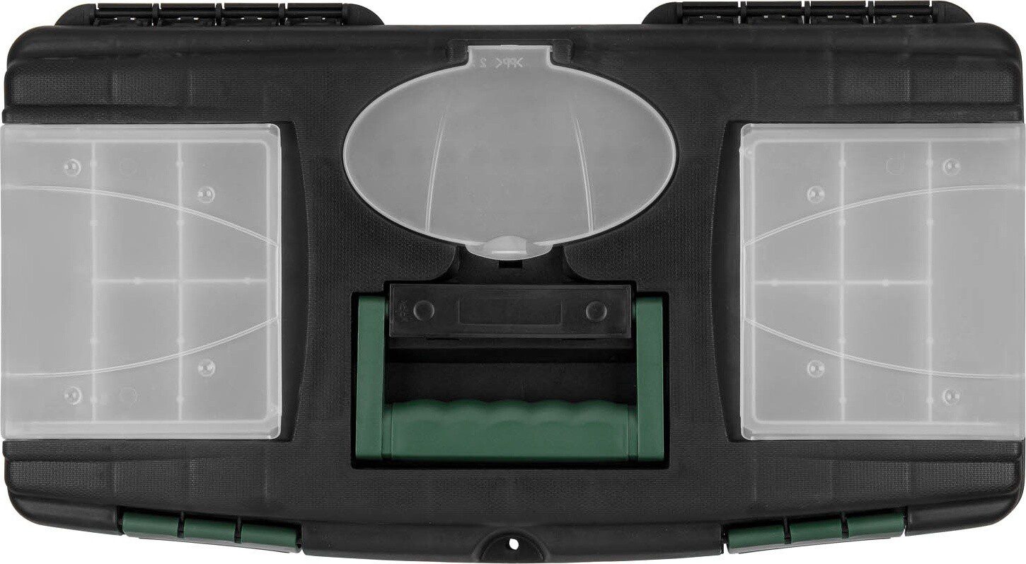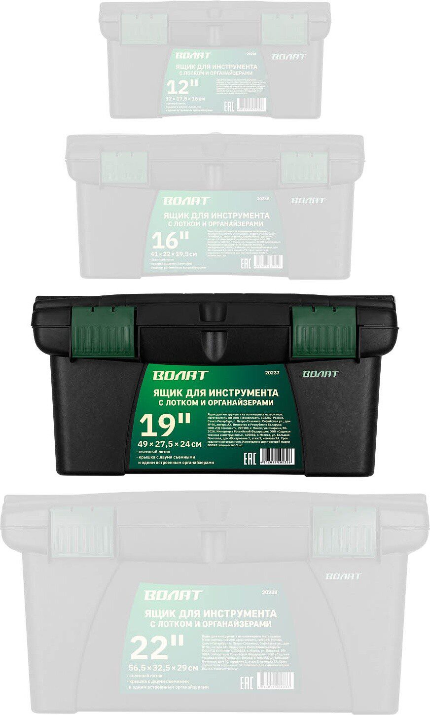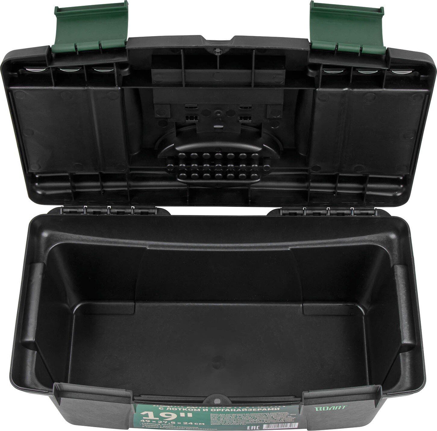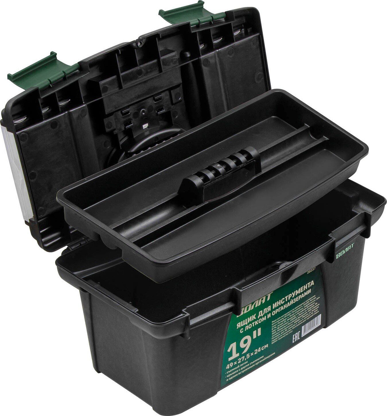 Ящик для инструмента ВОЛАТ 19″ (20237) предназначен для хранения и удобной транспортировки инструментов. Подвижный лоток и два съемных органайзера на крышке позволяют разместить необходимые инструменты и аксессуары. Ящик надежно закрывается с помощью защелок.