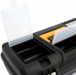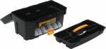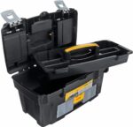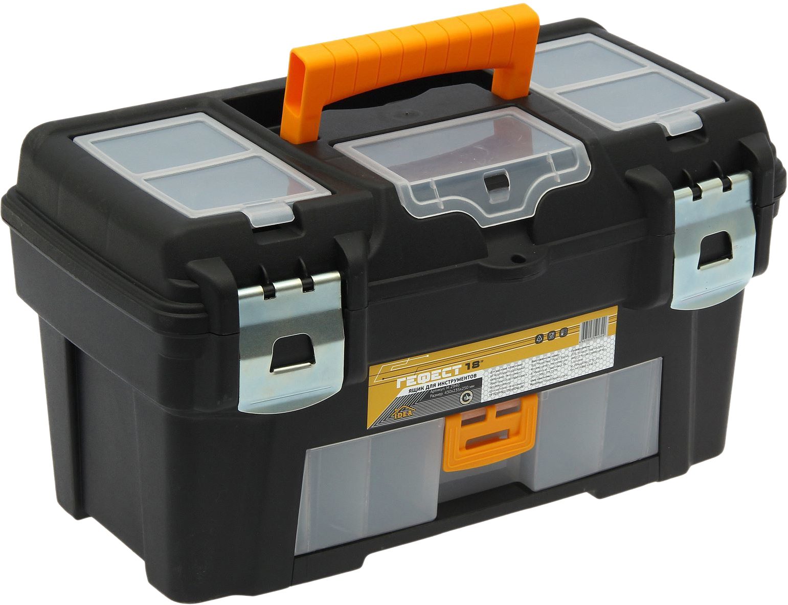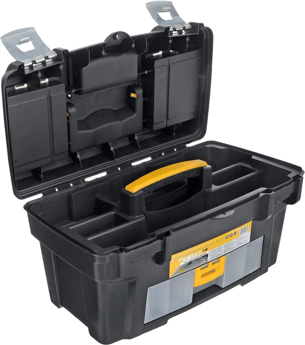 Ящик для инструмента пластмассовый ГЕФЕСТ 18 с консолью и секциями металлические замки (М2940) предназначен для хранения и транспортировки инструмента. Изготавливается из прочного пластика. Конструкция оснащена лотком для малогабаритного ручного инструмента. Для хранения крепежа и мелких деталей в крышку вмонтированы три органайзера с фиксированными перегородками. Для этих же целей в корпусе ящика находится выдвижная пятисекционная консоль. Складная ручка повышает удобство транспортировки. Металлические замки надежно закрывают ящик. Сохранности инструмента способствует наличие петель для навесного замка.