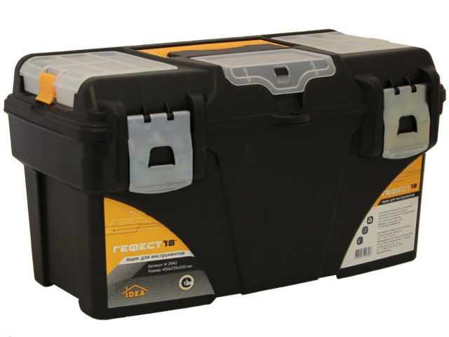 Ящик для инструмента пластмассовый ГЕФЕСТ 18 с коробками металлические замки (М2942) предназначен для хранения и транспортировки инструмента. Изготавливается из прочного пластика. Конструкция оснащена лотком для малогабаритного ручного инструмента. Для хранения крепежа и мелких деталей в крышку вмонтированы три органайзера с фиксированными перегородками. Складная ручка повышает удобство транспортировки. Металлические замки надежно закрывают ящик. Сохранности инструмента способствует наличие петель для навесного замка.