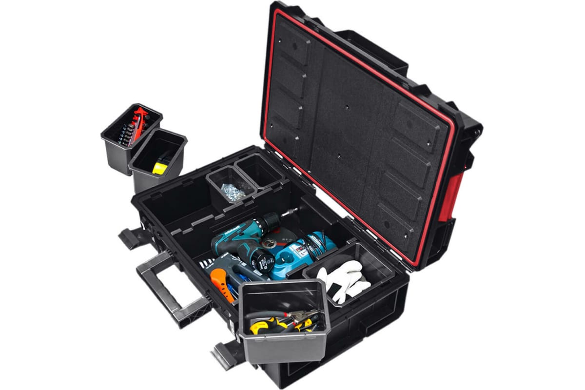 для распиловки длинномерных изделий. Усиленная конструкция крышки гарантирует большую вместительность и выдерживает нагрузку до 120 кг, позволяя создавать удобные рабочие помосты.