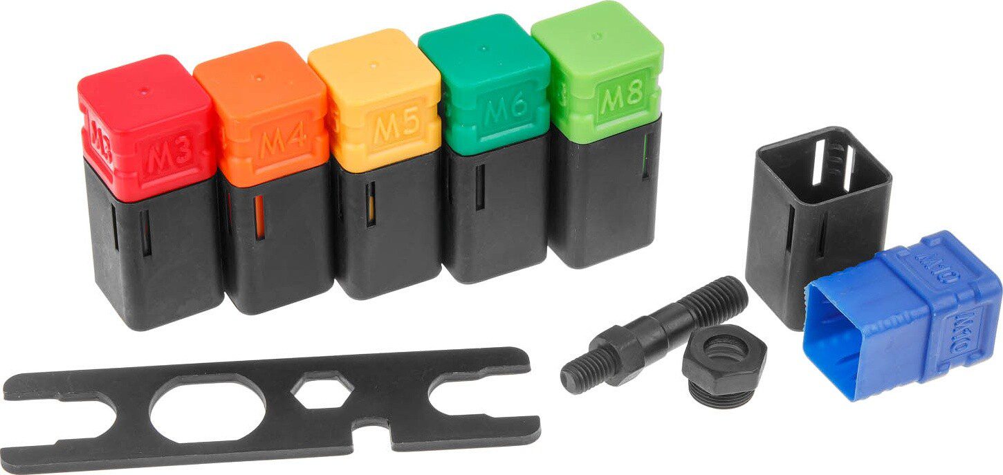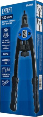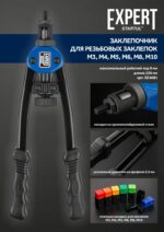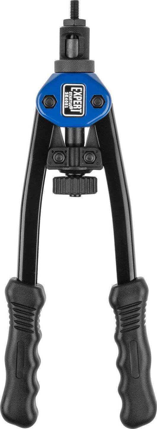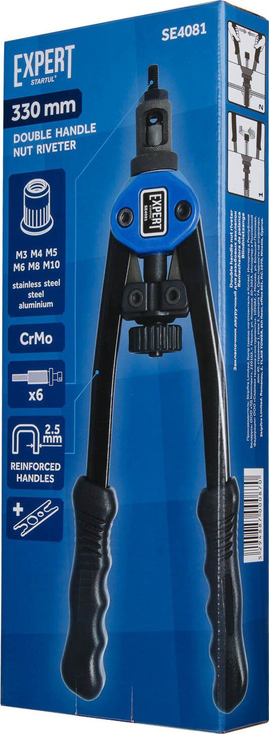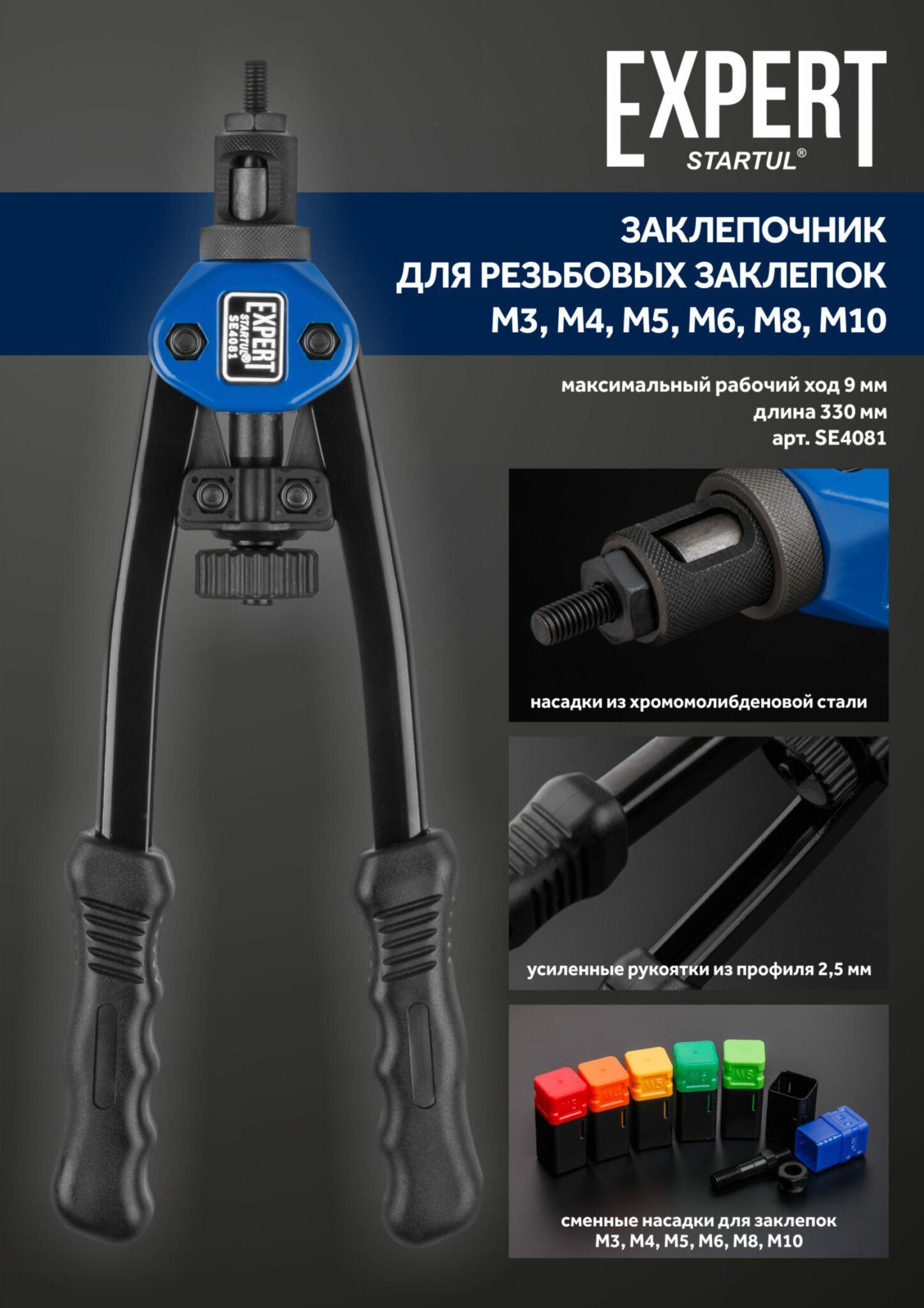 Заклепочник резьбовой STARTUL Expert (SE4081) предназначен для соединения листового металла, различных тонкостенных конструкций и металлических профилей. Материал насадок: хром-молибденовая сталь (CrMo). Максимальный рабочий ход: 9 мм, эффективный рабочий ход: 7 мм. Усиленные рукоятки из профиля толщиной 2,5 мм. Длина заклепочника: 330 мм.