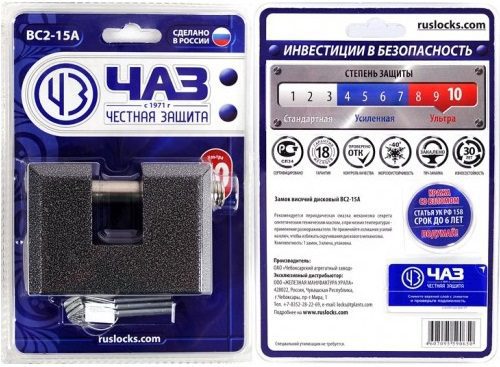 Замок навесной ЧАЗ ВС2-15А изготовлен из стали, благодаря чему отличается высоким уровнем прочности. Используется для запирания двери. Перед покупкой данного вида замка необходимо удостовериться, что отверстия проушин соосны и подходят по диаметру к дужке замка. При попытке вырывания дужки из замка выступающая кнопка отделяется, тем самым затрудняя противоправные действия.