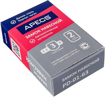 Замок навесной APECS PD-01-63 (00006677) предназначен для запирания дверей, снабженных дверными проушинами. При использовании замка в зимнее время при запирании наружных дверей рекомендуется, по мере необходимости, смазывать его графитовой или аналогичными смазками. Не использовать для чистки абразивные материалы и растворители.