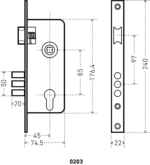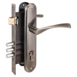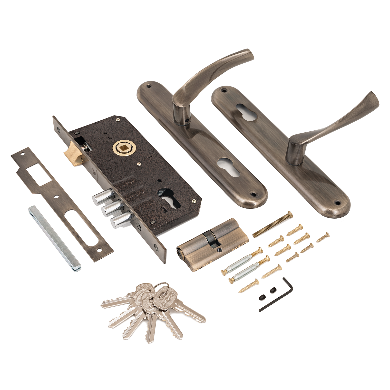 Замок врезной с ручкой АЛЛЮР 0203 AB ст.бронза серия “Классика”. Предназначен для установки в деревянные двери толщиной до 40мм, правого и левого открывания. Дверь может быть закрыта на защелку и открыта с помощью фалевой ручки при открытом засове замка. Три стальных ригеля круглого сечения диаметром 12мм, вылет 20мм. Универсальная защелка. Стальной корпус с подшипником, покрыт полимерной краской. Межосевое расстояние 85 мм. Удаление ключевого отверстия 45мм. Материал ручек алюминиевый сплав. Комплектация: цилиндровый механизм 68мм, 6 ключей, ответная планка, винтовые стяжки.