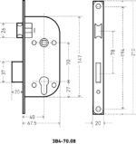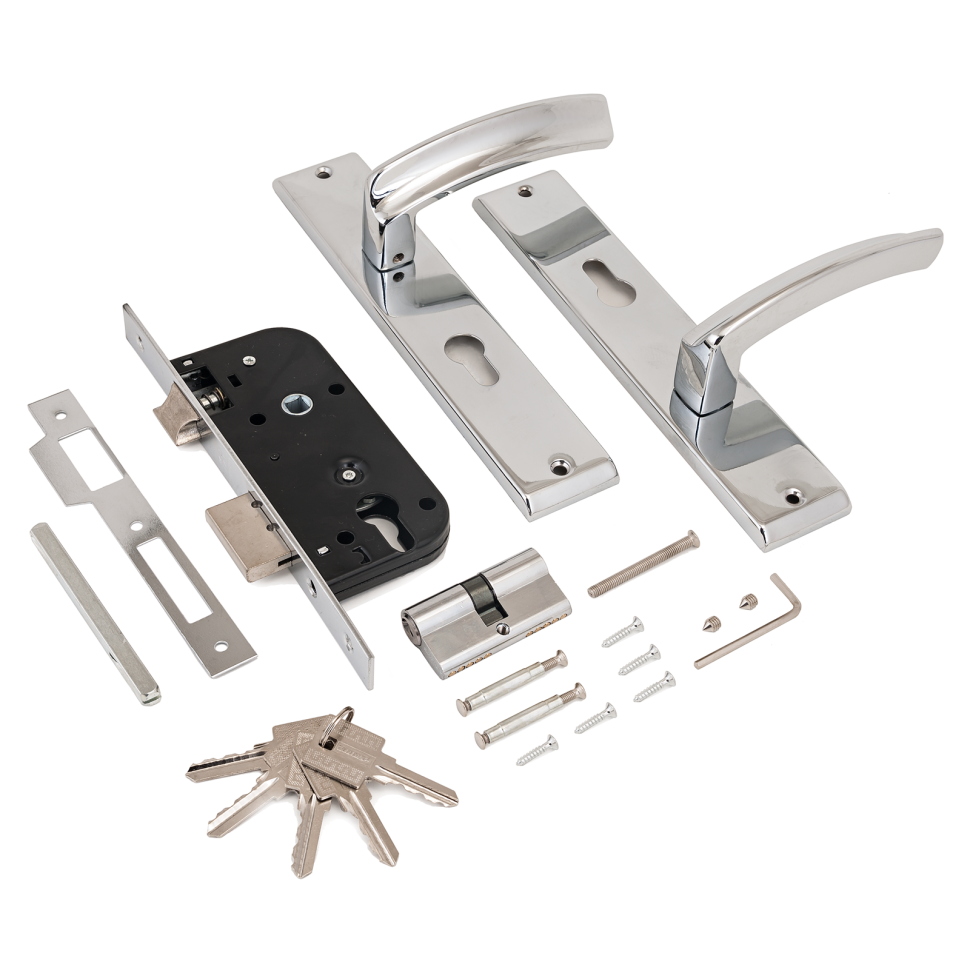 Серия «АРТ». Замок врезной с ручками. Предназначен для установки в деревянные двери толщиной от 30 до 40мм, правого и левого открывания. Дверь может быть закрыта на защелку и открыта с помощью фалевой ручки при открытом засове замка. Прямоугольный ригель, вылет 20мм. Универсальная защелка. Стальной корпус, покрытие – полимерная краска. Межосевое расстояние 70мм. Удаление ключевого отверстия 40мм. Материал ручек – сталь, алюминий. Гальваническое покрытие. Комплектация: цилиндровый механизм 60мм, материал ЦАМ/латунь, 5 ключей, ответная планка, винтовые стяжки.