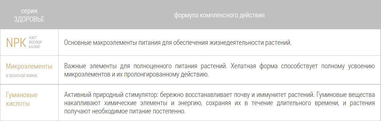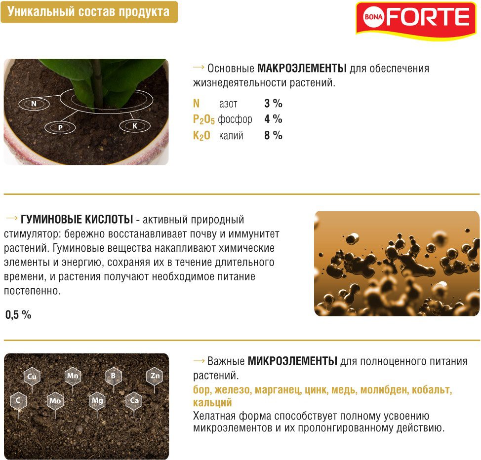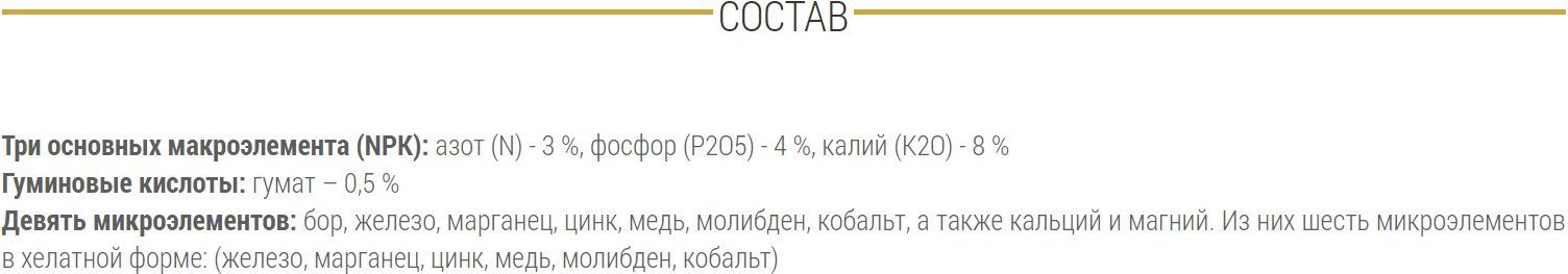 Три основных макроэлемента (NPK): азот (N) – 3 %, фосфор (P2O5) – 4 %, калий (K2O) – 8 %. Гуминовые кислоты: гумат – 0,5 %. Девять микроэлементов: бор, железо, марганец, цинк, медь, молибден, кобальт, а также кальций и магний. Из них шесть микроэлементов в хелатной форме: (железо, марганец, цинк, медь, молибден, кобальт).