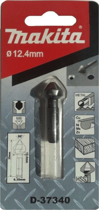 Зенкер 12.4х35 мм MAKITA (D-37340) имеет головку из быстрорежущей стали с тремя режущими кромками с углом заточки 90 градусов. Хвостовик зенкера Makita D-37340 шестигранный C-типа 6.3 мм. Длина инструмента для зенкования Makita D-37340 составляет 35 мм, при диаметре его режущей части 12.4 мм. Применяется зенкер Макита Д-37340 для зенкования глубоких отверстий М6 в дереве, металле не содержащем железо (Никель, Цинк), чугуне или пластике.