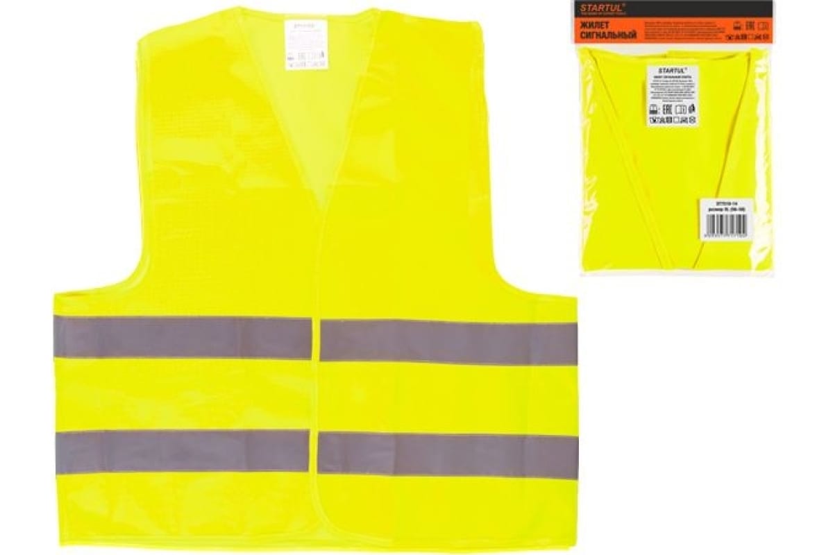 Жилет сигнальный STARTUL размер 56-58 желтый (ST7510-13) предназначен для обозначения присутствия людей при дневном освещении и ночью в свете автомобильных фар. Расстояние между верикальными полосами на спине – 20,5 см.Жилет сертифицирован по директиве EN 471:2003 “Одежда специальная сигнальная повышенной видимости” и имеет второй класс защиты.