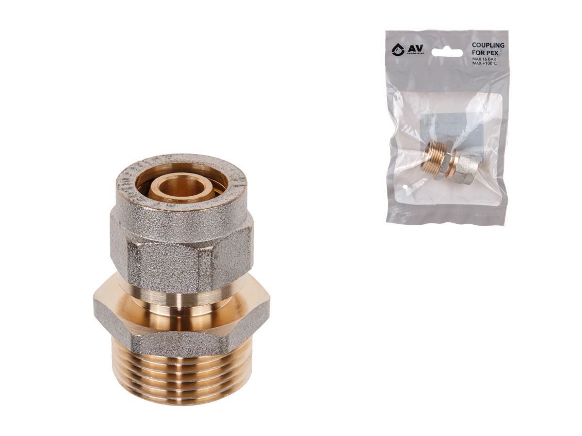 Ниппель 16(2.0) х 3/4″ нар. для труб PEX, AV Engineering (инд. упак.)